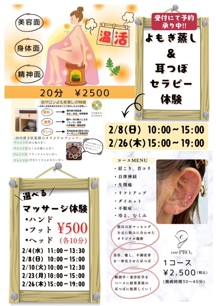 2026年2月 よもぎ蒸し&耳つぼセラピー体験のお知らせ